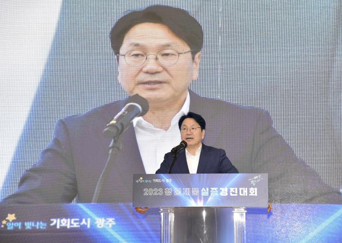 ▲강기정 광주광역시장이 29일 오후 시청 시민홀에서 열린 지역 창업기업의 혁신기술 실증을 위한 '창업제품 실증 경진대회'에 참석해 인사말을 하고 있다. [광주광역시 제공]