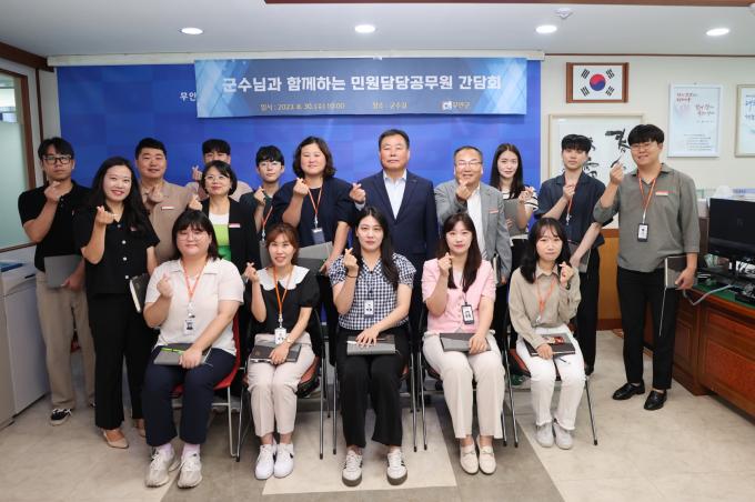 신청사 건립 시 환경 등 각 부서 민원 대처 전담 직원 배치 요청 김산 전남 무안군수가 30일 민원 업무를 담당하고 있는 직원의 애로사항을 듣고 악성 민원 해결책을 모색하기 위한 간담회를 개최했다.