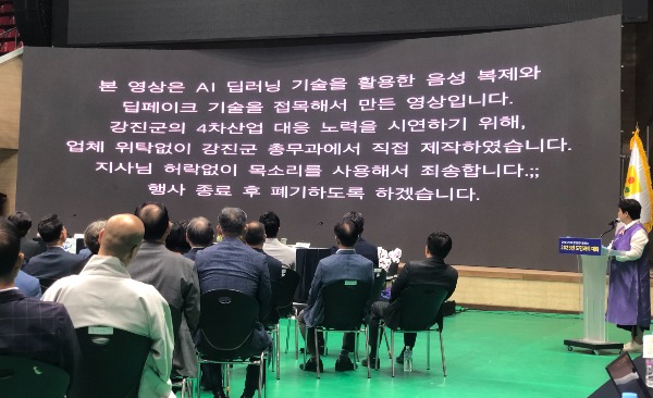강진군은 이날 김영록 전남지사가 관선시절 8개월 동안 근무했던 1994년도 영상을 '4차 산업 AI 딥러닝 기술'을 활용한 '음성 복제'와 '딥페이크' 기술을 접목해서 만들어 선보이면서 눈길을 끌었다.