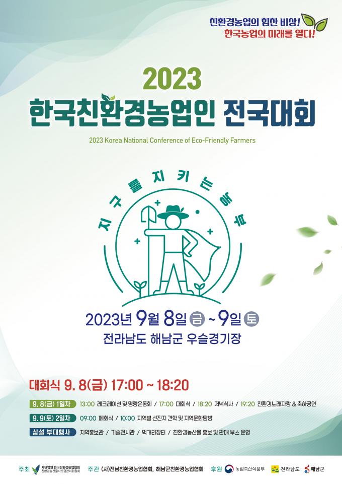한국친환경농업인 전국대회는 (사)한국친환경농업협회와 친환경농산물자조금관리위원회가 주관하는 대회로 시도별 격년제로 개최되며, 올해에는 개최 시군 공모를 거쳐 해남이 선정됐다.