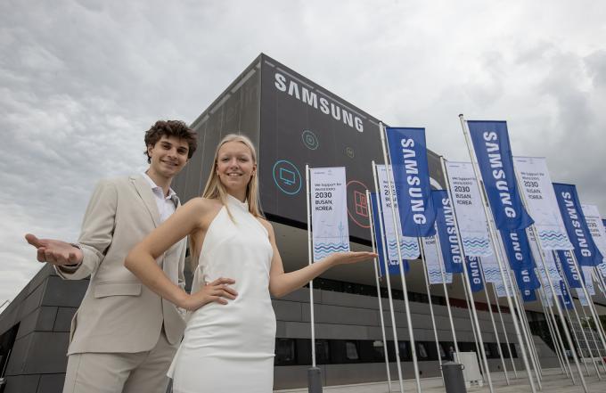 삼성전자는 가로 길이 20미터의 대형 스크린 영상에 부산 엑스포 엠블럼을 포함하고 전시장 곳곳에 엑스포 응원 문구를 게재했다.