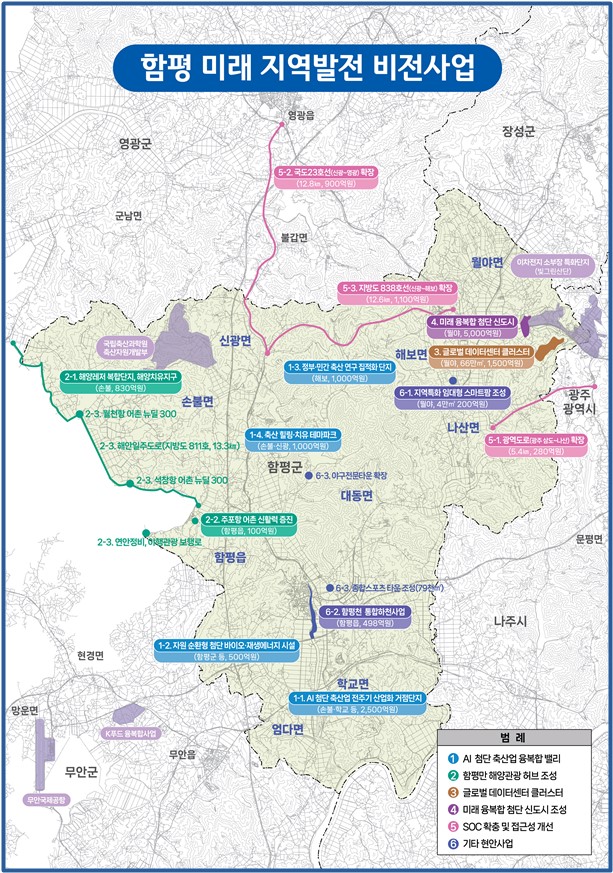 이밖에도 초기 자본과 영농 경험이 부족한 청년이 함평에 빠르게 정착하도록 200억 원 규모의 '지역특화 임대형 스마트 팜'을 조성하고, 지역 젖줄인 함평천에 498억 규모의 '통합하천 국가사업'을 유치해 생태, 문화, 관광이 어우러진 명품 하천을 만들 계획이다. 대동면 일원엔 570억 원을 들여 전국 규모 스포츠 대회가 가능한 종합 레저스포츠타운도 조성한다.