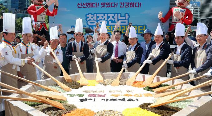 이번 행사에는 김영록 전남도지사, 농수산업 생산유통 관계자들, 한식 명장들로 이뤄진 (사)대한민국한식포럼 회원들은 전남 22개 시군에서 생산된 쌀과 농수산물로 만든 비빔밥을 만들어 시식하며 전남 농수산물을 적극 홍보하고 판촉에 힘을 보탰다.